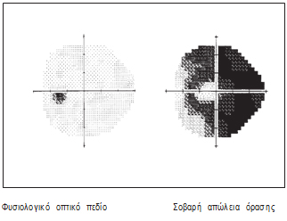 Το οπτικό σας πεδίο αναφέρεται στο πόσο καλά μπορείτε να δείτε γύρω σας,συμπεριλαμβανομένων των αντικειμένων στη περιφερική σας όραση. Ένα φυσιολογικό οπτικό πεδίο φαίνεται αριστερά στην εικόνα, ενώ η δεξιά εικόνα αντιπροσωπεύει ένα παθολογικό οπτικό πεδίο – Δρ Κ. Καραμπάτσας – Χειρουργός Οφθαλμίατρος