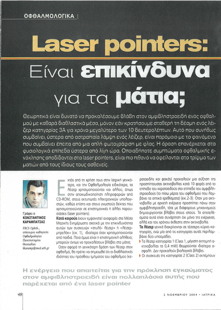 Θεωρητικά είναι δυνατό να προκαλέσουμε βλάβη στον αμφιβληστροειδή ενός οφθαλμού με καθαρά διαθλαστικά μέσα, μόνο εάν κρατήσουμε σταθερή τη δέσμη ενός λέιζερ κατηγορίας 3Α για χρόνο μεγαλύτερο των 10 δευτερολέπτων. Αυτό που συνήθως συμβαίνει, ύστερα από αστραπιαία λάμψη ενός λέιζερ, είναι παρόμοιο με το φαινόμενο που συμβαίνει έπειτα από μια απλή φωτογράφιση με φλας. Η όραση επανέρχεται στα φυσιολογικά επίπεδα ύστερα παό λίγη ώρα. Οποιαδήποτε συμπτώματα οφθαλμικής ενόχλησης αποδίδονται στα laser pointers, είναι πιο πιθανό να οφείλονται στο τρίψιμο των ματιών από τους ίδιους ασθενείς – Δρ Κ. Καραμπάτσας – Χειρουργός Οφθαλμίατρος